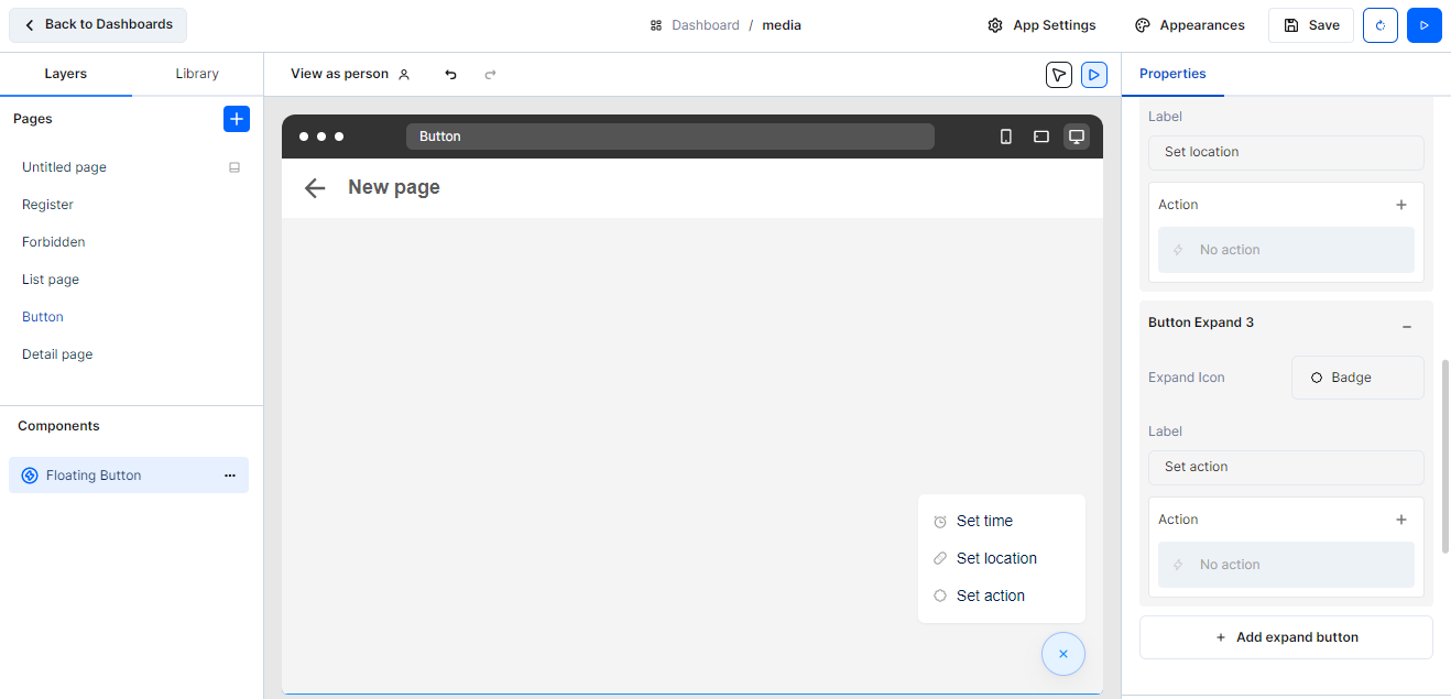 Type : mengatur tipe dari button, terdapat pilihan action dan expand. Jika action